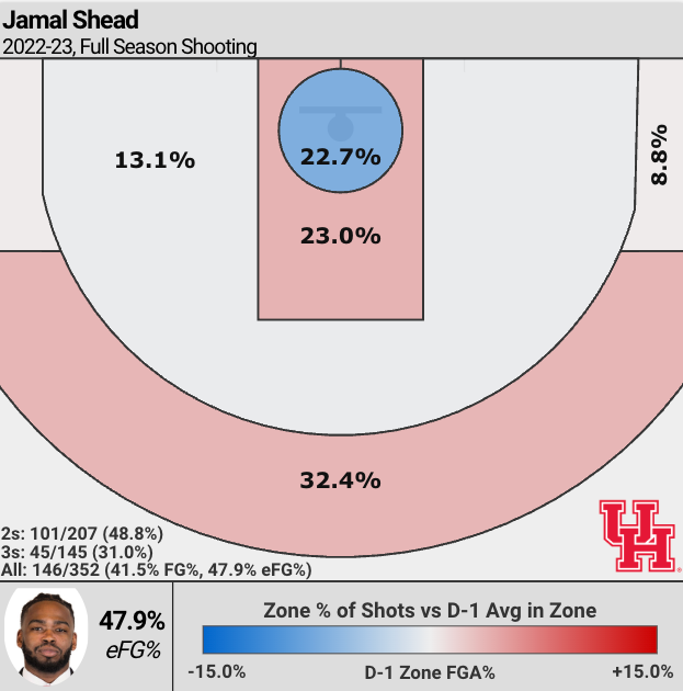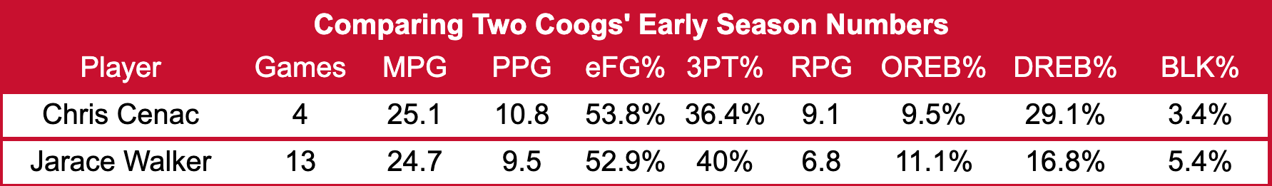 The big man’s season is tracking eerily similar to former top Coog recruit Jarace Walker’s lone season with Sampson, with Cenac having a minor edge on rebounding rate and Walker having the edge on block rate. Getting that level of production early from Cenac insulates this Houston team from the front-court drop-off you’d expect a team to face, after losing Roberts, but adds an offensive dimension that last year’s team just simply didn’t have, and allows defensive menace Joseph Tugler to focus on his strengths.