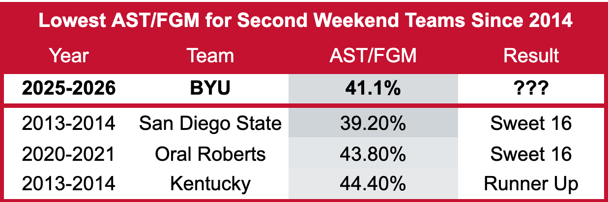 But can a team win in March if the majority of their points come in isolation? In the last 10 NCAA tournaments, only 28 teams have advanced to the Sweet 16 with an assist rate of 50% or lower, and just three teams have had an assist rate below 45%.