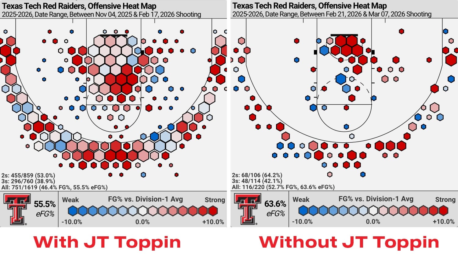 When Texas Tech announced JT Toppin’s injury last month, throwing dirt on their NCAA Tournament chances was an understandable impulse. The Preseason All-American forward accounted for over a quarter of the team’s field goal attempts, leading the team in scoring. Perhaps just as important, his 105 offensive rebounds accounted for 38.6% of the team’s offensive rebounds at the time of his injury.
