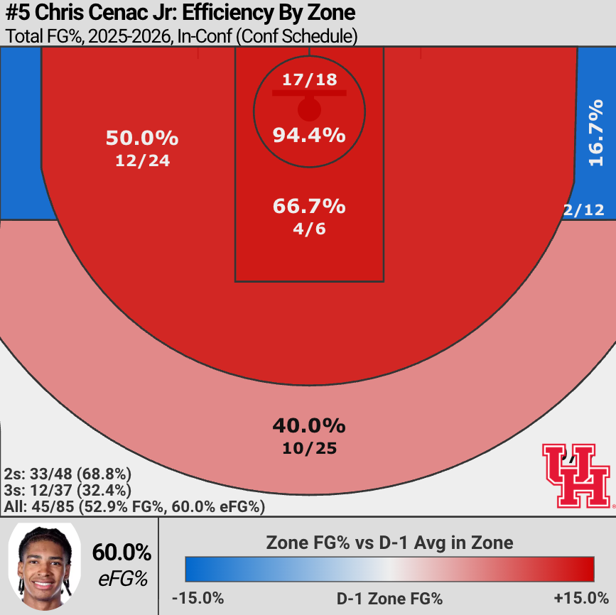 Cenac continues to be a three-level shooter, with a major reason for that being the limited spacing playing next to Joseph Tugler provides, in addition to the need for pathways to the rim to be available for Flemings when he gets downhill. But Cenac’s mobility allows him to play outside, crash the basket, and provide length at the low block, supporting Tugler, who is the Coogs’ primary rim protector.