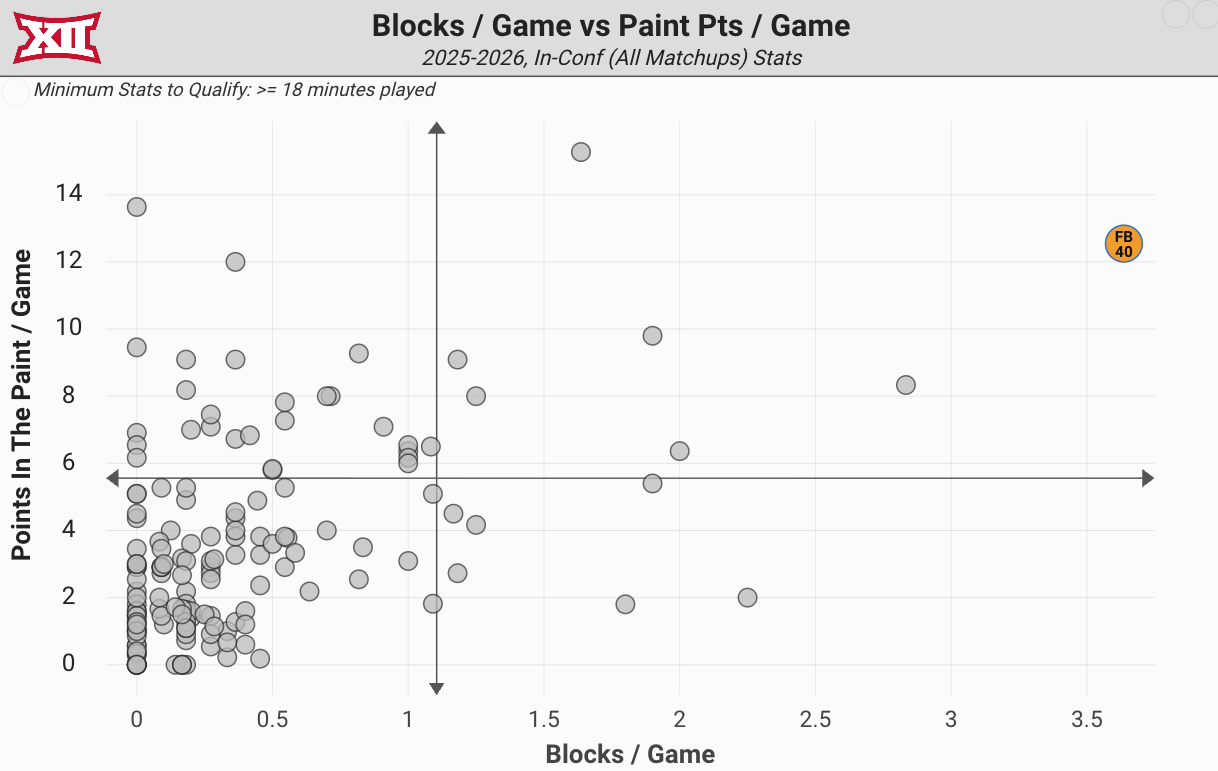 The center is averaging the third most paint points per game in the Big 12 this season, while averaging nearly a block per game more than anyone else in the conference. And he’s been able to provide this physicality while playing 32.7 minutes per Big 12 game, thanks to his ability to avoid fouling.