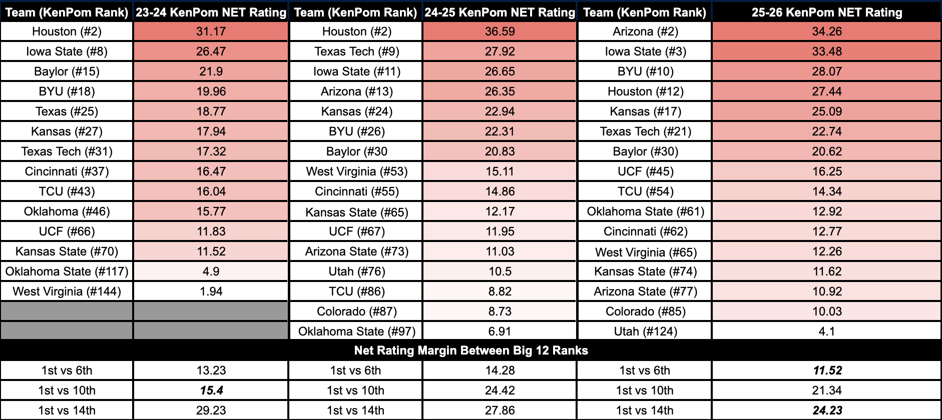 Comparing the last three seasons, the KenPom Net Rating of the conference (Adjusted Efficiency Margin of victory for a team if they were to place the “average” Division I team for that season) comes in as its most competitive this season. The difference in margin for the conference’s highest-ranked KenPom team compared to the sixth-ranked team and for the first-ranked team and the 14th-ranked team is the tightest it’s been since expansion.