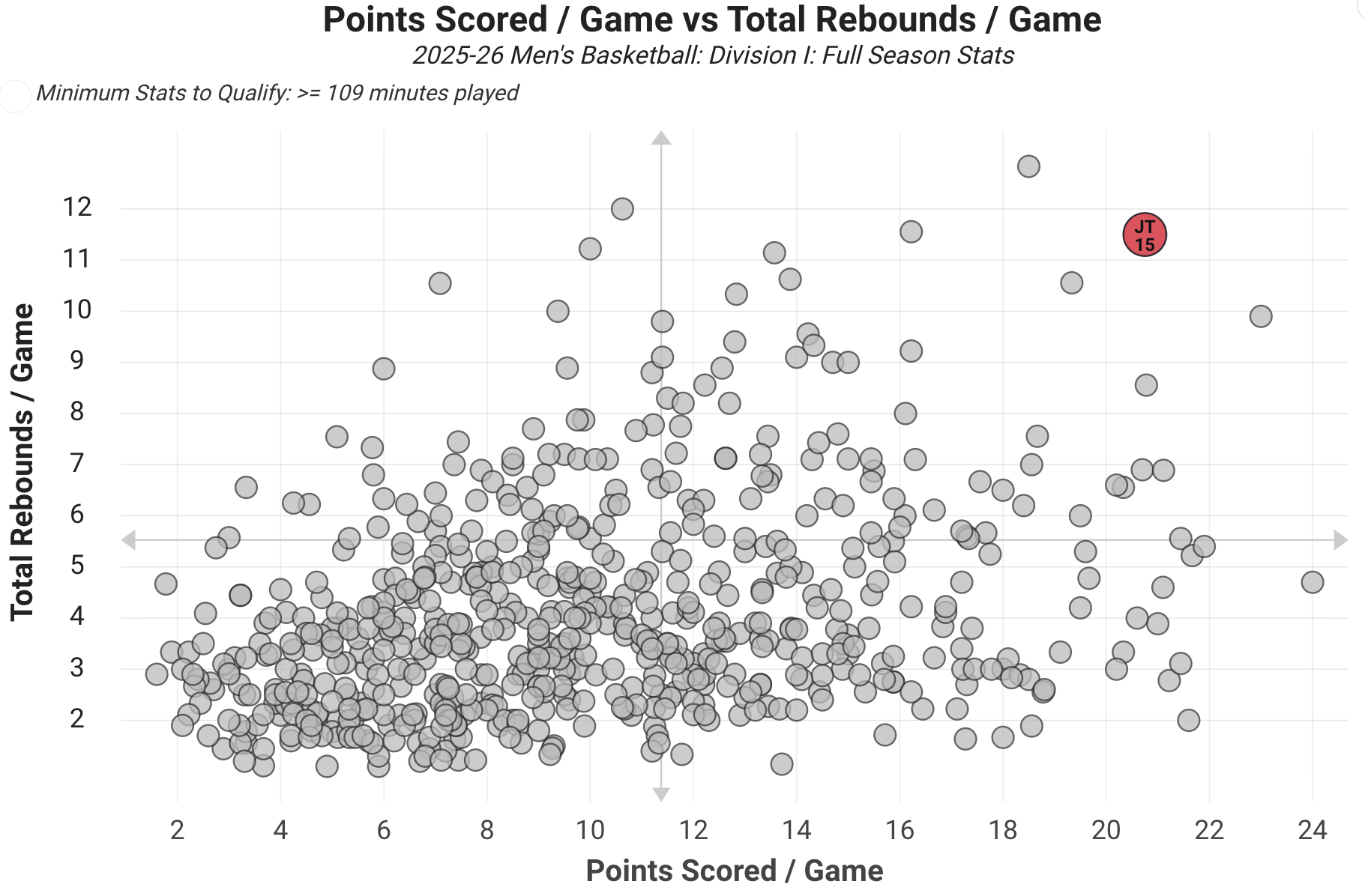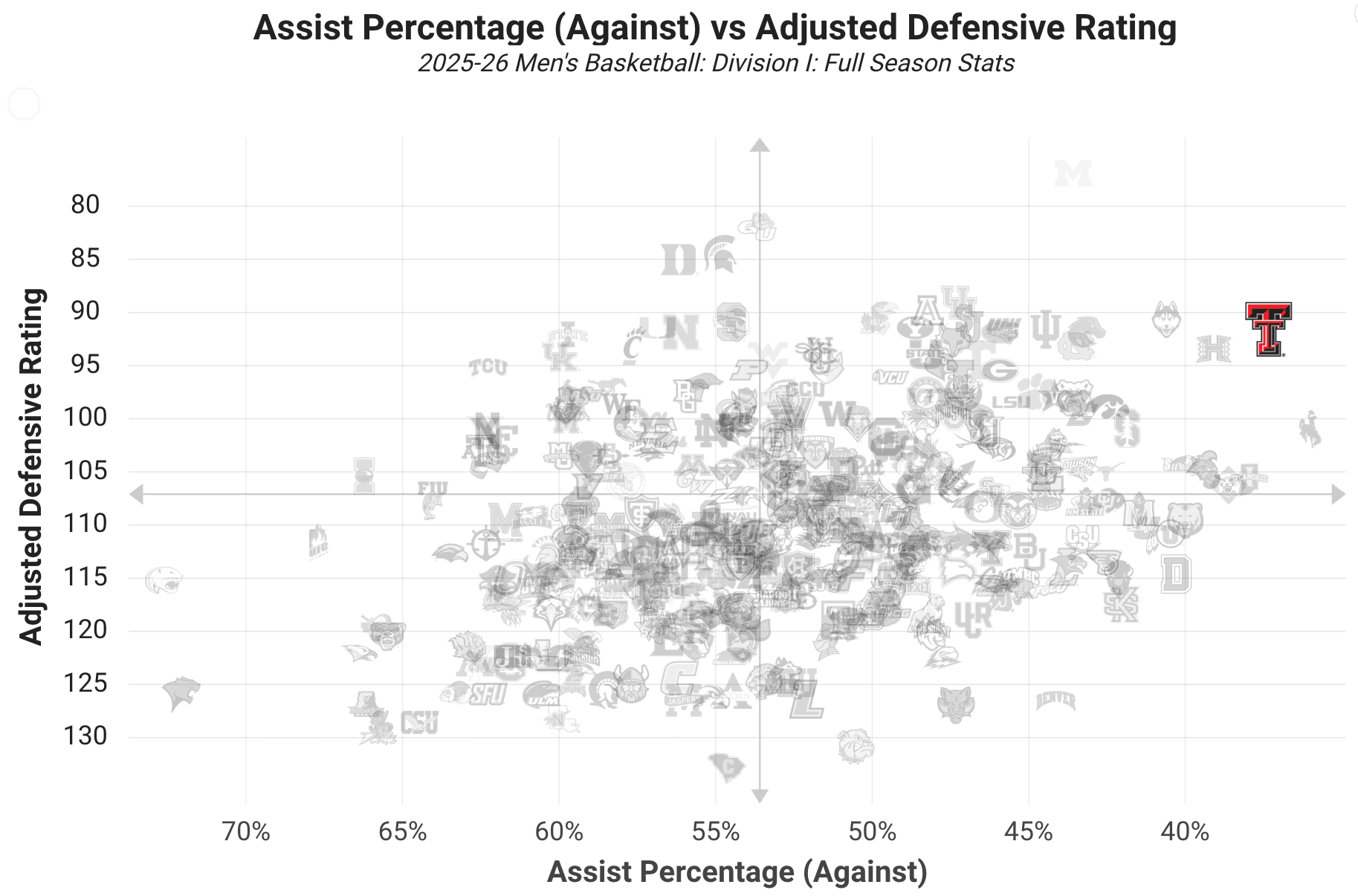 But as it stands, the Red Raiders provide elite perimeter defense, holding opponents to just 29% shooting on the twenty-third fewest attempts per game in the nation. Their considerable size throughout their rotation makes them great at switching and closing off passing lanes, limiting opponent assists to just 37.3% of total made field goals.