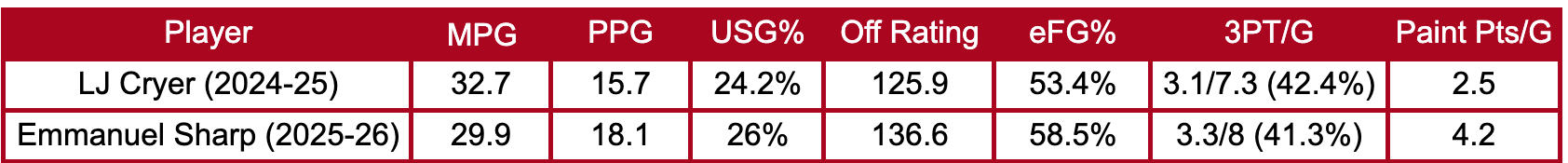 But over the first 10 games of the season, it’s not just been Sharp playing the role Cryer had last season; it’s been Sharp exceeding Cryer’s production. The senior guard is averaging 18.1 points, 3.2 rebounds and 2.2 assists this season.