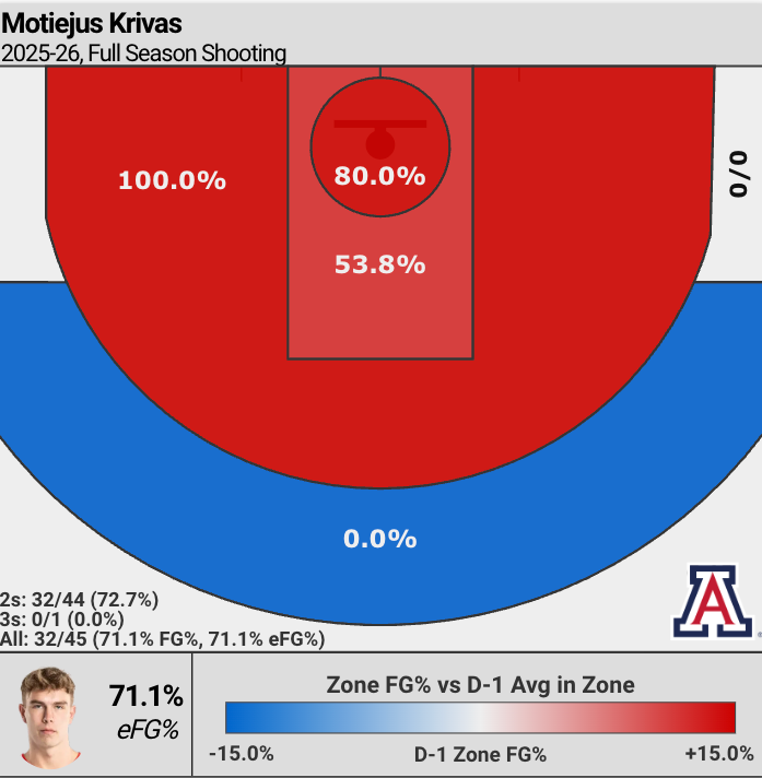 Freshman Koa Peat leads the way in terms of attempts and usage this season on the team and frontcourt, averaging 15.9 points on 10.9 field goal attempts, but it’s truly a platoon approach for the additional scoring from the bigs. Tobe Awaka, Motiejus Krivas and Ivan Kharchenkov average 6, 5 and 4 attempts from inside the arc per game, respectively. Krivas is shooting a blistering 72% inside the key and 80% at the rim.