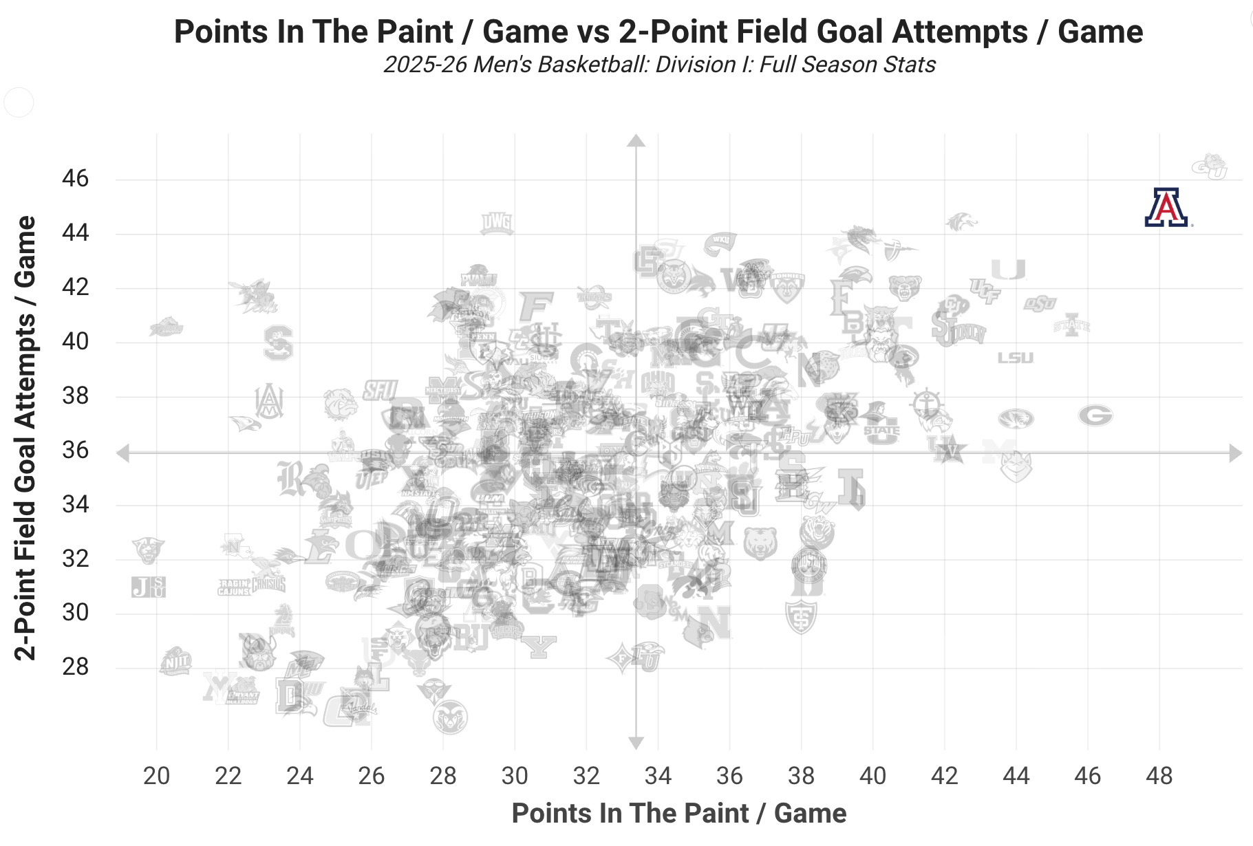 But Arizona doesn’t need to get out in transition to score. Their 48.6% field goal shooting in the halfcourt is in the 97th percentile of Division I. That effectiveness is leveraged further by the fact that the Wildcats rank 21st in the country in offensive rebounds per game, and have on of the highest putback attempt rates in the country.