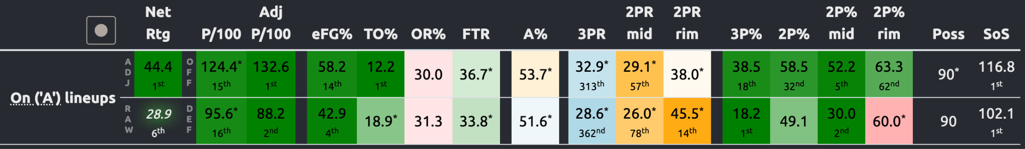 For all the discussion of a lack of a true point guard, the lineup only has a 12.2% turnover rate. The observed efficiency margin of this lineup on EvanMiya (47.1) is the 15th-highest among lineups with at least 90 possessions played together in the country.