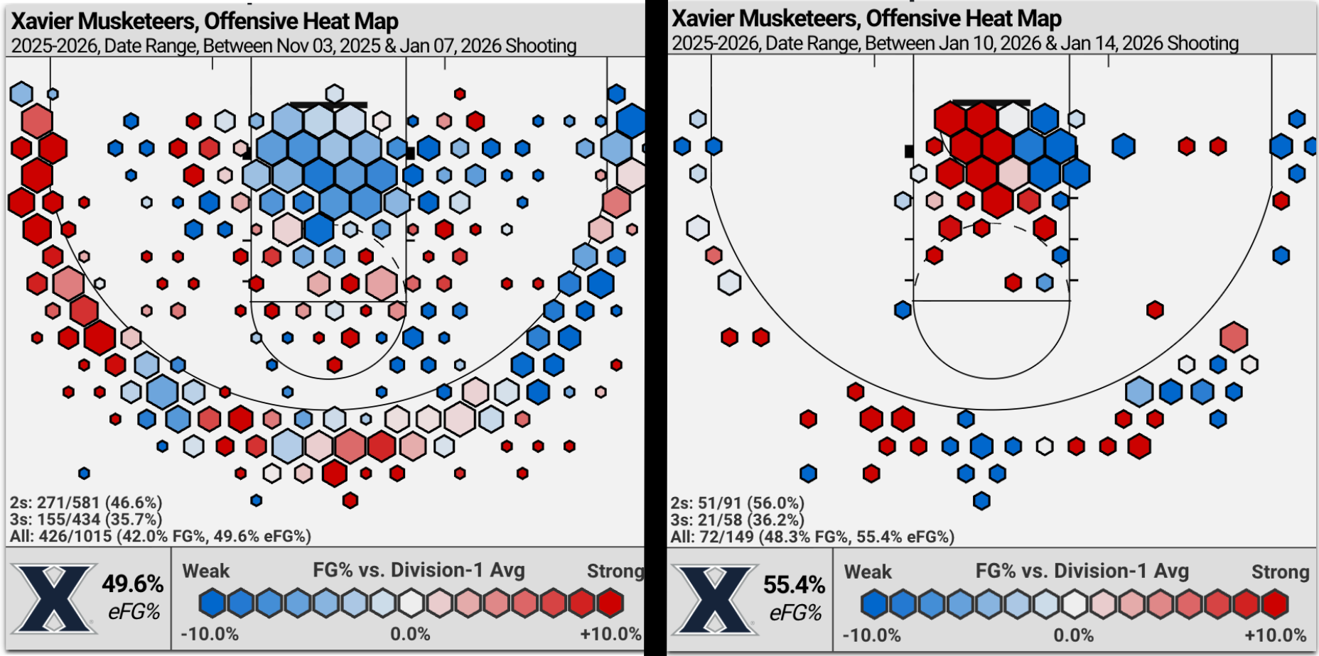 Xavier is now 7-2 when it attempts at least 27.5% of its shots inside 4.5 feet.