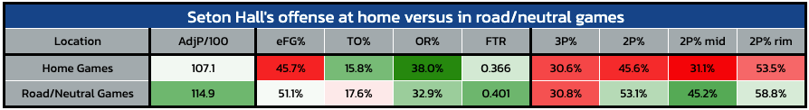 The bright side is that Seton Hall has played exceptionally well away from the Prudential Center this season. The Pirates are 6-1 in road/neutral games, with wins over NC State, Kansas State, and Providence to their name in such environments. Namely, the Pirates’ offense has been substantially better in road or neutral games compared to at home: