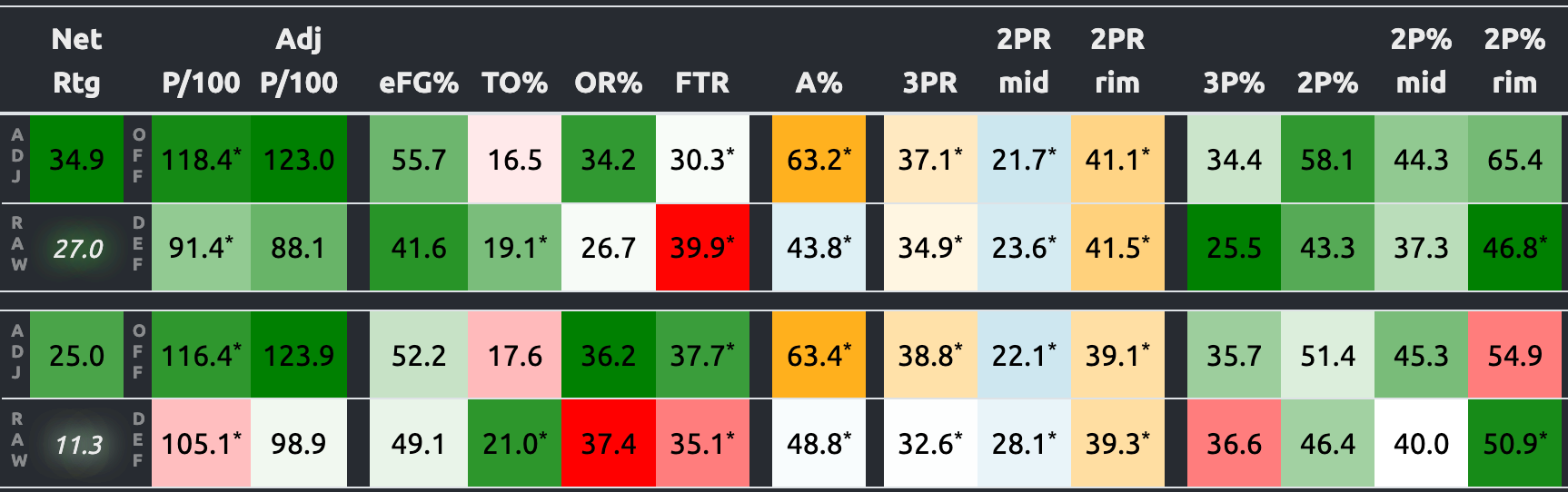 The biggest changes have been on the defensive end. The Huskies have still been strong at limiting shot efficiency, but not nearly at the elite level they were earlier. The larger issue, though, is on the glass, where UConn is giving up a 37.4% offensive rebounding rate over its last five games compared to only a 26.7% rate over its first 15.
