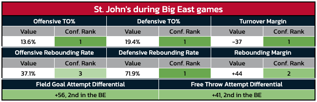 St. John’s is the only Big East team to rank in the top-5 of the league in both FGA margin and FTA margin — and it ranks top-2 in both categories.