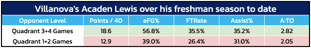 Lewis has had a strong freshman season, averaging 11.9 points and 5.2 assists per game. However, he has averaged just 5.8 points on 7-for-37 (18.9%) shooting across Villanova’s four toughest games: vs. BYU, at Michigan, vs. St. John’s, at UConn. The drop-off in performance from Quadrant 3+4 games to Quadrant 1+2 games is notable: