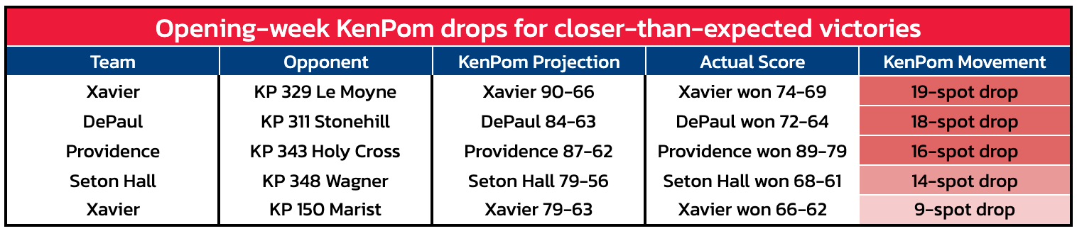 Xavier, especially, is off to a poor start. Combine the two closer-than-expected wins with a home loss to Santa Clara as a four-point favorite, and the Musketeers have already fallen from preseason No. 62 on KenPom to No. 107 – lowest of any Big East team.