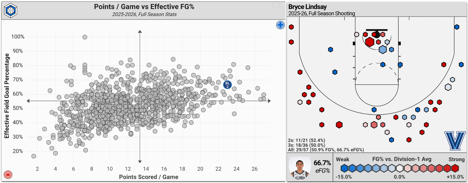 The James Madison transfer followed up his game against BYU with 25 points against Queens, showcasing his attacking with 6-for-11 shooting inside the arc and a 10-for-11 showing at the free-throw line. Since then, he has been back to his perimeter ways, combining to shoot 12-for-22 from deep in wins over Sacred Heart and Duquesne. Of the 64 players averaging 20+ points per game this season (min. 3 GP), Lindsay ranks 21st in effective field goal percentage at 66.7%: