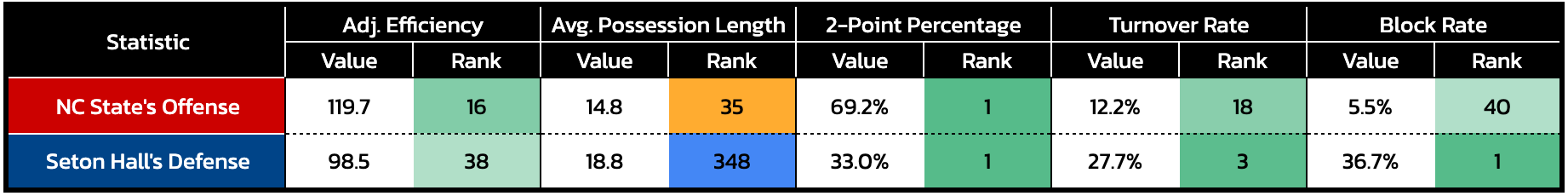 The Pirates’ meeting with the Wolfpack will not just be telling because it's against a high-major opponent, though. Seton Hall’s interior defense has been its calling card through four games this season, leading the nation in 2-point percentage allowed. That interior stoutness will be tested by an NC State team that, although 3-point oriented (ninth in 3PAr), leads the nation in 2-point percentage when it does attack: