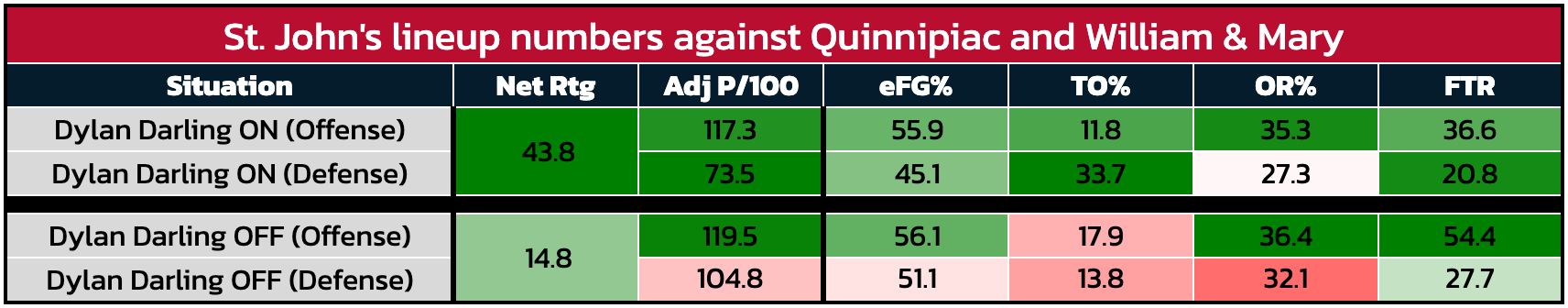 Isolating the two games in which Darling played, St. John's is surrendering 31.3 fewer adjusted points per 100 possessions when he is on the floor versus without: