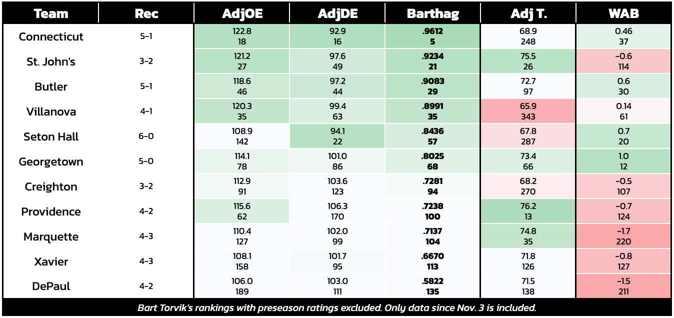 UConn and St. John’s were projected to be the Big East's top teams this season, and they have largely lived up to those expectations. The Huskies are 5-1 with a win over BYU and a four-point loss without Tarris Reed to Arizona. St. John’s is just 3-2 but its losses have both come by single-digits to highly-rated teams in Alabama and Iowa State; the Red Storm need a signature win to perhaps solidify elite status but Bart Torvik’s efficiency rankings with preseason expectations excluded still rates them second-best in the league.