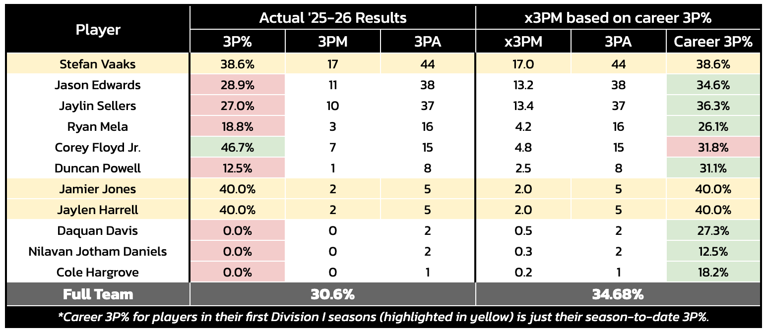 Additionally, the perimeter shots should start falling. Of the eight Friars with prior collegiate shooting numbers, only one is shooting better than his career percentage from beyond the arc this season. Taking into account the volume of attempts from each player and their respective career marksmanship, Providence’s expected 3-point percentage this season is 34.68% (equivalent to ~133rd nationally) as opposed to its actual 30.6% rate: