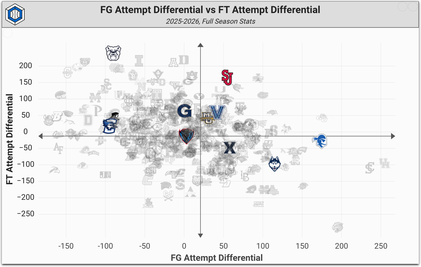 The Huskies and Musketeers both posted higher effective field goal percentages than St. John's in their respective games, but neither could overcome massive free-throw attempt disparities. Add in the win over DePaul, and St. John's attempted 52 more free throws than its opponents over the three wins.