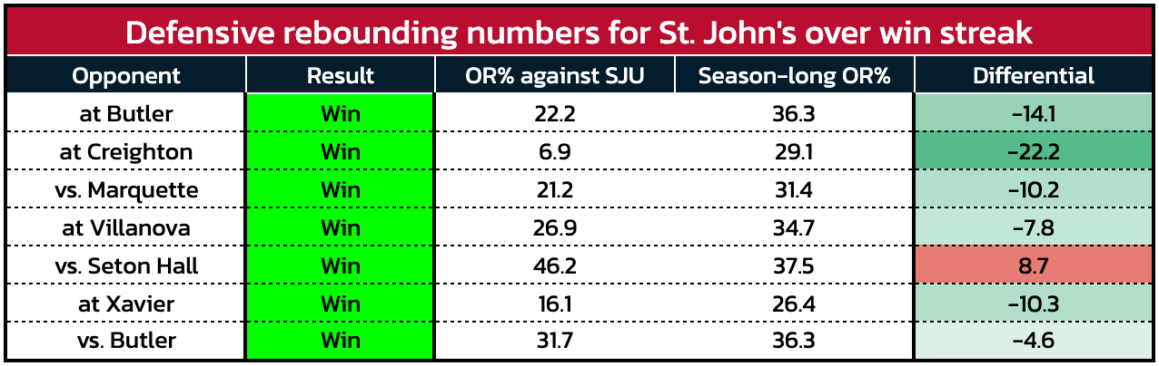 Still, early in the season, it was not uncommon for St. John’s to allow an offensive rebounding rate higher than its opposition season-long rate. The early-season losses to Alabama, Iowa State, Auburn and Kentucky all included surrendering at least a 30% offensive rebounding rate; three included giving up a rate over 44%. While the Red Storm still only rank 249th in defensive rebounding rate for the season, they have held six of their last seven opponents below their season-long rates: