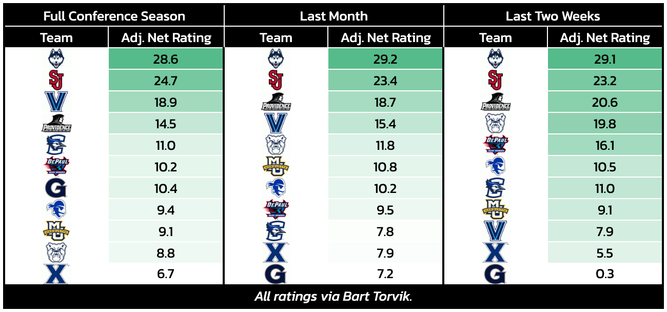UConn followed it up with a home win over Seton Hall that was perhaps more stressful than hoped but nonetheless a victory. As such, the Huskies appear in strong position to land a No. 1 seed at the NCAA Tournament — most-likely in the South Region with the first two rounds to be played in Philadelphia, PA.