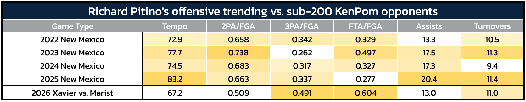 Marist didn’t make a field goal from that point forward, though, and a Jovan Milicevic 3-pointer with 1:46 left put Xavier ahead for good. It may not have been pretty relative to expectations, but ugly wins are still wins. With this one now in the back pocket, how did the tempo and play style match how Pitino-coached teams have performed in the past?