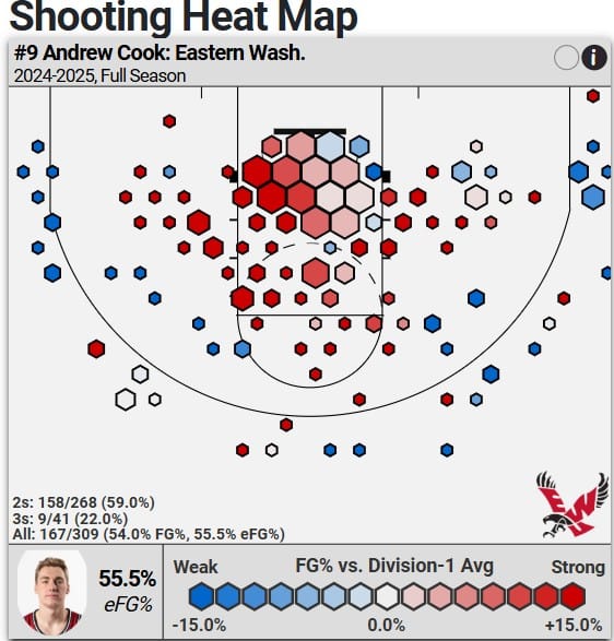 The defense was a major culprit. EWU struggled badly go get stops if it did not force a miscue, ranking outside the top 300 in every Four Factor except turnover rate. For all of Cook’s immense offensive skill, he was an outright poor defender, and fellow returners Tyler Powell and Elijah Thomas moved the needle in the wrong direction as well.