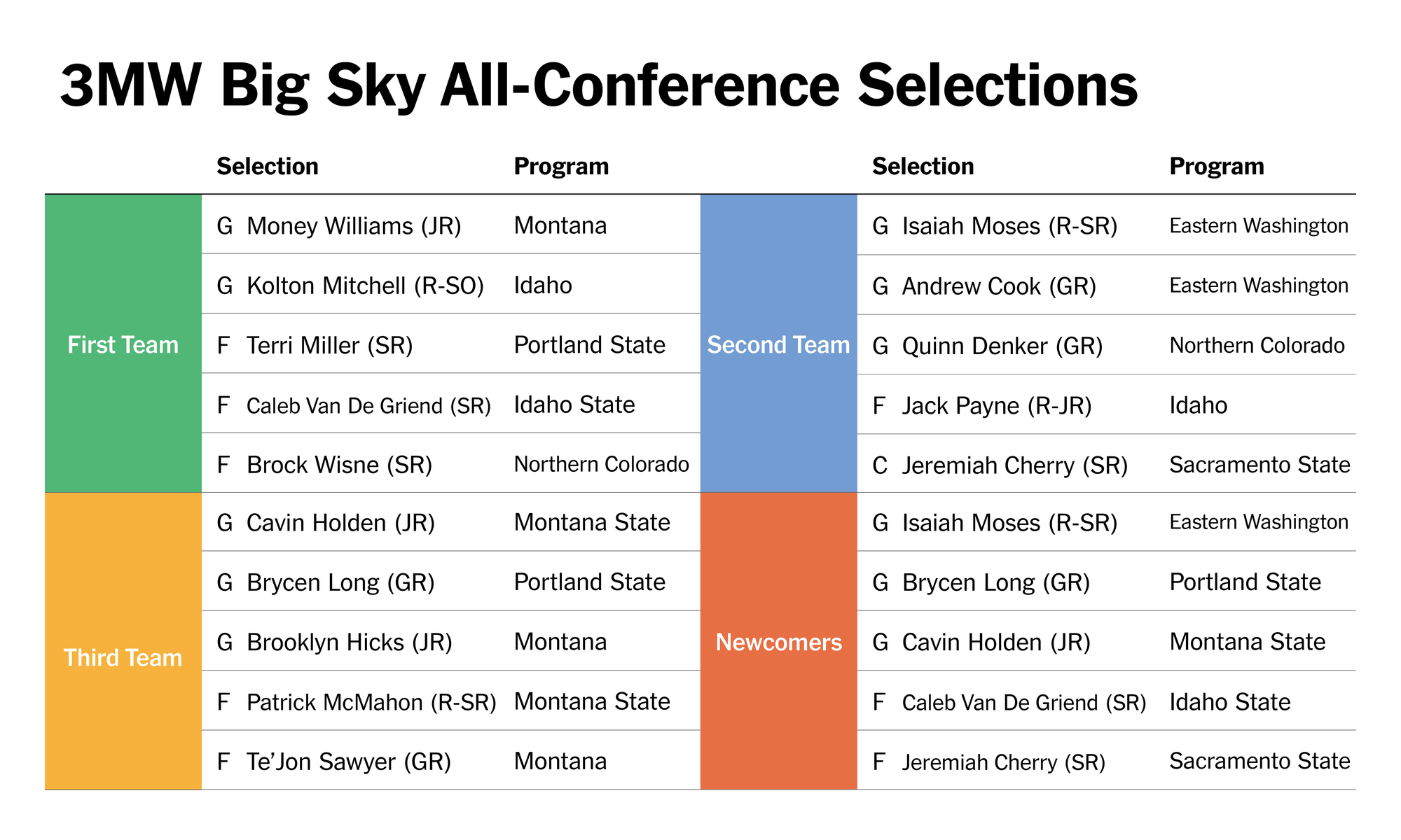 Montana has the best coach in the league, a potential star in the backcourt in Williams, and a rotational rock up front in Sawyer. The large collection of newcomers offers both upside and depth. The Grizzlies should be right in the mix to repeat as regular season conference champs.