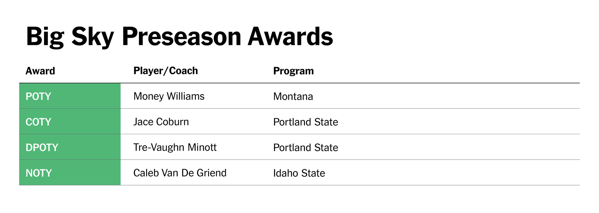 Yes, he is from Division II, but there’s a very real chance Van De Griend is the best interior player in the conference. If he is the best player overall, no qualifier, then Looney and the Bengals could leapfrog even last year’s squad in their ascent up the Big Sky. That marriage of player and coach is as strong a pairing as you’ll find in this conference.