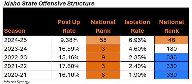 Compared to Looney’s traditional style, it was a somewhat unconventional team. ISU ranked in the top 10 nationally in Post Up rate for four straight years from 2021-24, but they had no one capable of scoring inside last year, so the offense shifted. Of course, some of this shift was also a result of having Dylan Darling’s brilliance on the perimeter: