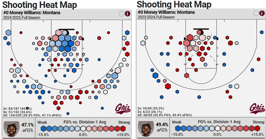 That wrecked his efficiency in ball screens in particular. He scored just 0.664 points per possession as a PnR handler, per Synergy, landing him in the 27th percentile nationally. Like the finishing, he was much better as a freshman (again, tiny sample), tallying 0.885 PPP (73rd percentile) in 2023-24. He needs to be closer to his freshman year self, which could be tough without the security blankets of Brandon Whitney, Malik Moore and Kai Johnson. If Williams remains erratic, Montana’s offensive ceiling will be slightly capped.