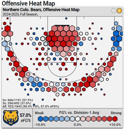 Any of that trio offering some defensive resistance would be a welcome sight. Northern Colorado has struggled on that end under Smiley, as his focus on skill in both the recruiting and development phases has left the Bears short of serious stoppers. The imbalance is perfectly demonstrated via KenPom’s rankings: