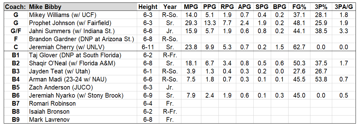 Williams is an immense piece for this league, a skilled and smooth operator on the ball who should excel now that he’s back to being The Guy (he struggled as a bit piece for UCF). He’s long and strong on the ball, showing solid passing vision and a mind for scoring. If he does struggle, Bibby brought in a terrific insurance policy in Prophet Johnson, a crafty on-ball operator in the MAAC who posted a crisp 2.26 assist/turnover ratio (91st percentile nationally) while also being one of the best rebounding guards in the country.