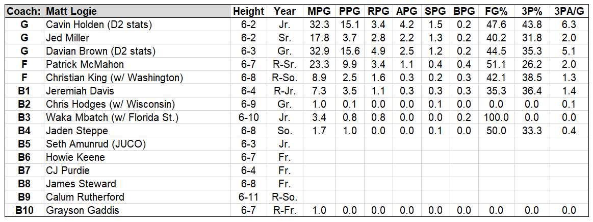 McMahon will anchor the interior attack, but Logie also added multiple playmakers on the perimeter to assist Miller. Logie himself hails from the Division II level, so bringing in Cavin Holden (Central Washington) and Davian Brown (Biola) makes a lot of sense. Holden is more of a pure point guard, but his dialed-in jumper should allow him to play next to Miller at times. Brown tilts more towards scorer/secondary creator who can get to the charity stripe.