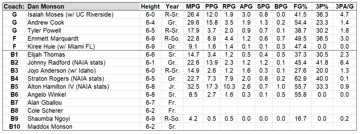 Both Powell and Thomas are likely to net some minutes again this season, as is Idaho transfer Jojo Anderson. All three were emphatically negative players in the Big Sky last season, so it would take some major progress from each to suddenly help push the Eagles up the standings. Per EvanMiya, out of 93 players who logged at least 300 possessions, they ranked as the #54 (Powell), #80 (Anderson) and #85 (Thomas) players in the conference. If the NAIA transfers do not work out, EWU is going to be alarmingly thin after the Moses-Cook-Marquardt trio.