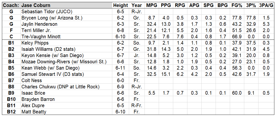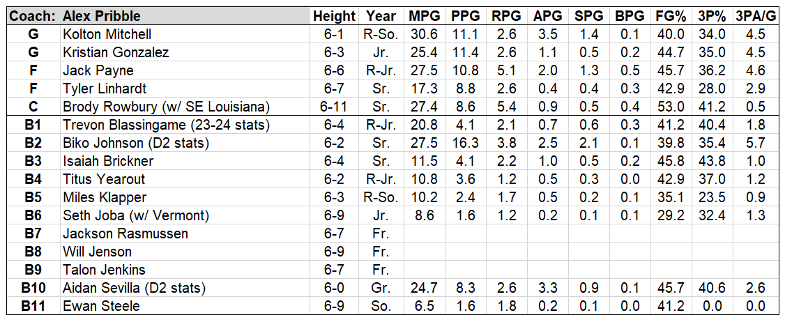 That will allow Pribble’s spread onslaught to continue, though he also has a new device in his toolbox. That would be the enormous Brody Rowbury, a 6-11, 255-pound behemoth who is returning home to Idaho. He is a true bulldozer inside, gobbling up offensive rebounds and generally proving to be unguardable on the block (1.163 points per post up possession, 93rd percentile nationally). He posted the 4th-best offensive rating in the entire Southland, albeit on lower usage.