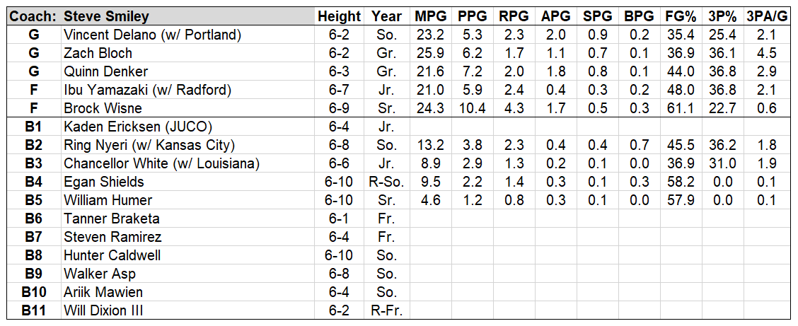 Denker and Ericksen’s creation will be more important without Jaron Rillie and Langston Reynolds, who combined to average 8.0apg. Their absence clears the runway for transfer PG Vincent Delano to take off in Smiley’s system. He had the typical rookie struggles as a lead guard – perhaps even more exaggerated for a terrible Portland team – but he’s the type of buy-low talent with which Smiley has hit home run after home run.