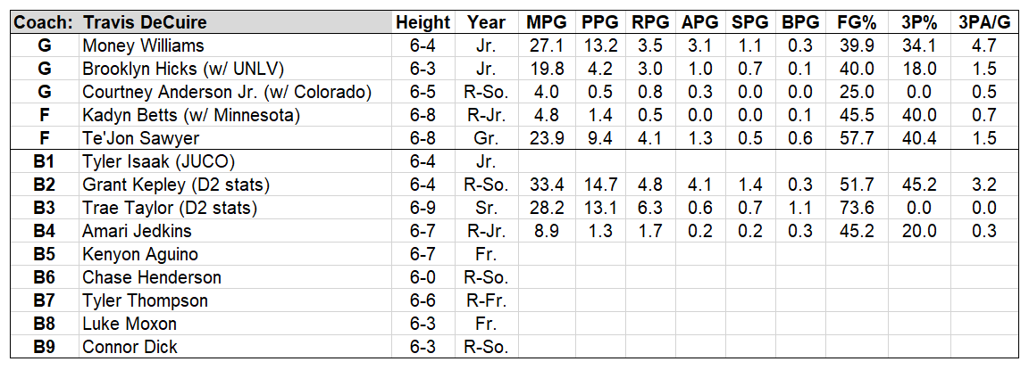 DeCuire gives Montana a chance every year. The Grizzlies’ roster pushes them towards favorite status this season, with two vital returning lineup bookends as the foundaiton: scoring guard Money Williams and versatile, burly forward Te’Jon Sawyer . Add in another deep and high-upside transfer core, and the Griz will be in the mix for DeCuire’s fifth Big Sky title.