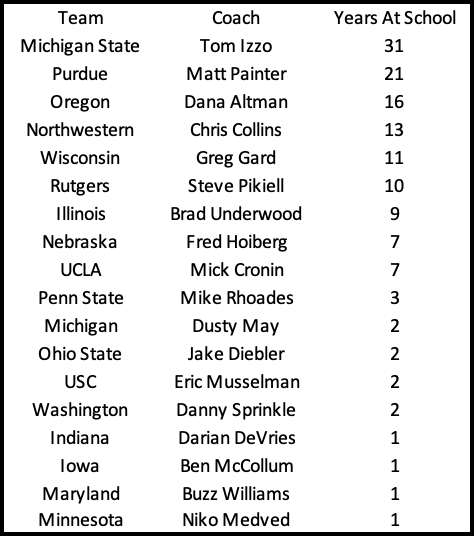Before diving into each of the coaches, let's first take a look at where the Big Ten coaches stand as a whole. Starting with how many years each coach has been at their school.