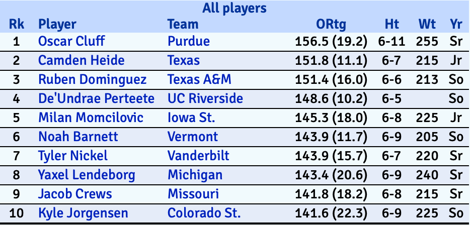 Per Kenpom, Oscar Cluff has the best offensive rating in the country (#2 is also former Boilermaker, Camden Heide). This doesn't mean BEST offensive player, as that has to take into account things like usage and creation, but in the looks Cluff gets, he's been nearly automatic.
