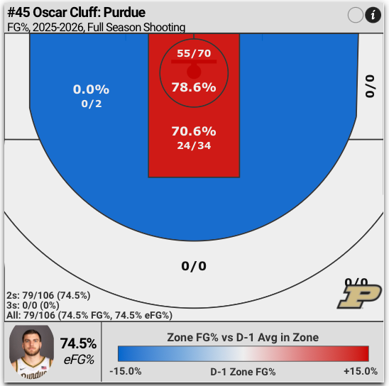 On the season, Oscar Cluff is shooting 74.5% from 2 on 6.6 attempts per game. That's the 13th best 2P% in the country.