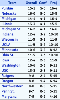 Above is the current Big Ten standings this season. Looking at the projected record column, I can't remember this big of a gap between the top tier and the middle tier. I mentioned it last week, but the number of Big Ten teams that make the tournament is so up in the air. It could be as few as probably 7 teams, and if things break right, it could probably get up to 11. The only issue is that outside of the top 5 teams, there isn't one specific team to have a ton of confidence in.