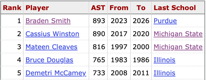 Coming into the season, it was almost a certainty that Braden Smith would break the Big Ten assist record, with the NCAA record within realistic reach. Smith still has a bit to go for the NCAA record, although he's currently on pace to break that in potentially the 3rd post season game of this season.