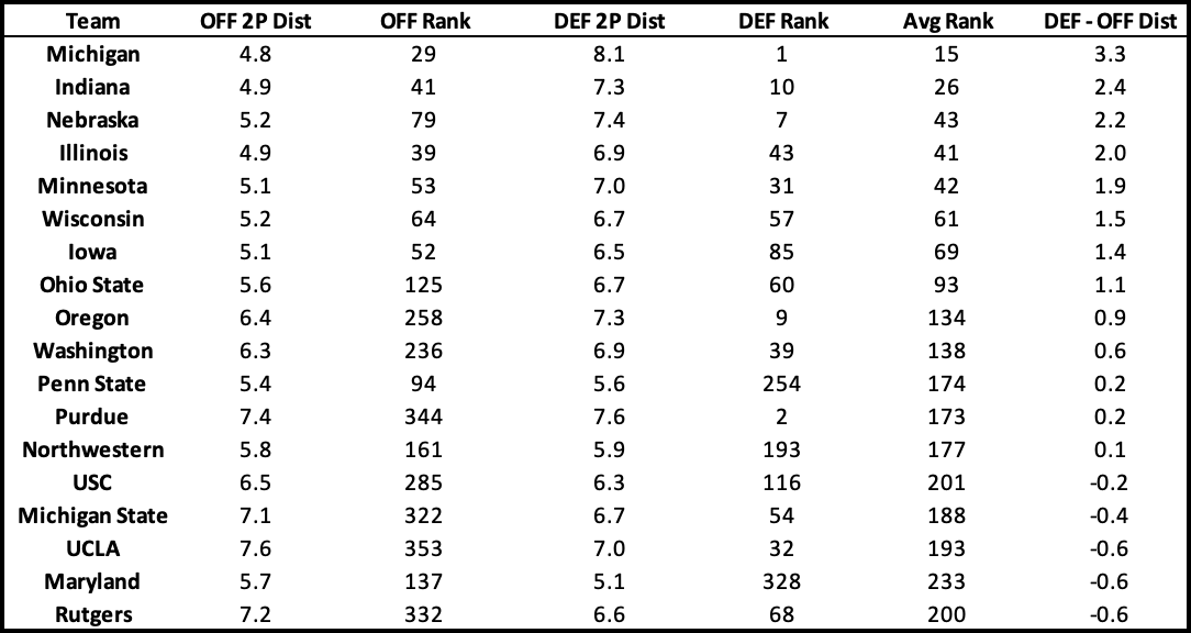 Some other things to note. UCLA is 353rd in the country in offensive 2P distance as they love to live in the mid range. Rutgers and Michigan State are the other two offenses that rank in the bottom 40 in the country. Only USC, Northwestern, Penn State, and Maryland rank below 100 in defensive 2P%.