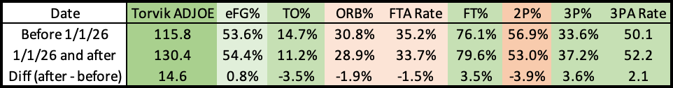 Since January 1, 2026, Wisconsin has had the 2nd best offense in the country per Torvik, and have been the 14th best team overall. After waiting a couple months, this team is finally starting to take shape into what many expected - a high powered offense that needs to just do enough defensively. If we filter for the beginning of the season through December 31, 2025, Torvik had the Badgers ranked as the 69th best offense. At the end of the day, full season sampling is much better for determining the true level of a team, but this does pose an interesting point. The question becomes then, what have the Badgers done differently in conference play vs non-conference?