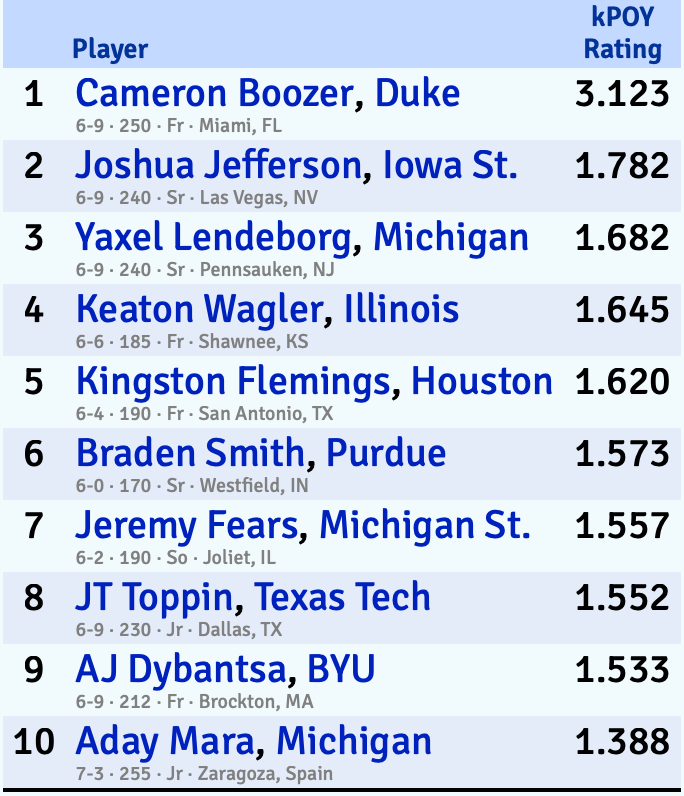 Above shows the Kenpom Player of the Year standings. Although no Big Ten player has a chance to really win NPOY (and only very few players in HISTORY would've had a chance against Boozer this season), there currently are 5 players in the top 10 for rankings.