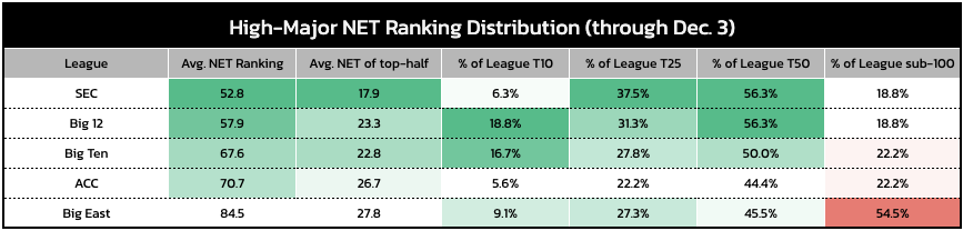Although early, the SEC again looks to be in the best shape as far as number of teams competing for bids. League size (16 teams) contributes, but they lead high-major leagues in average NET ranking, average NET ranking of top-half teams, and hold the highest percentage of teams ranking in the top-25 and top-50.