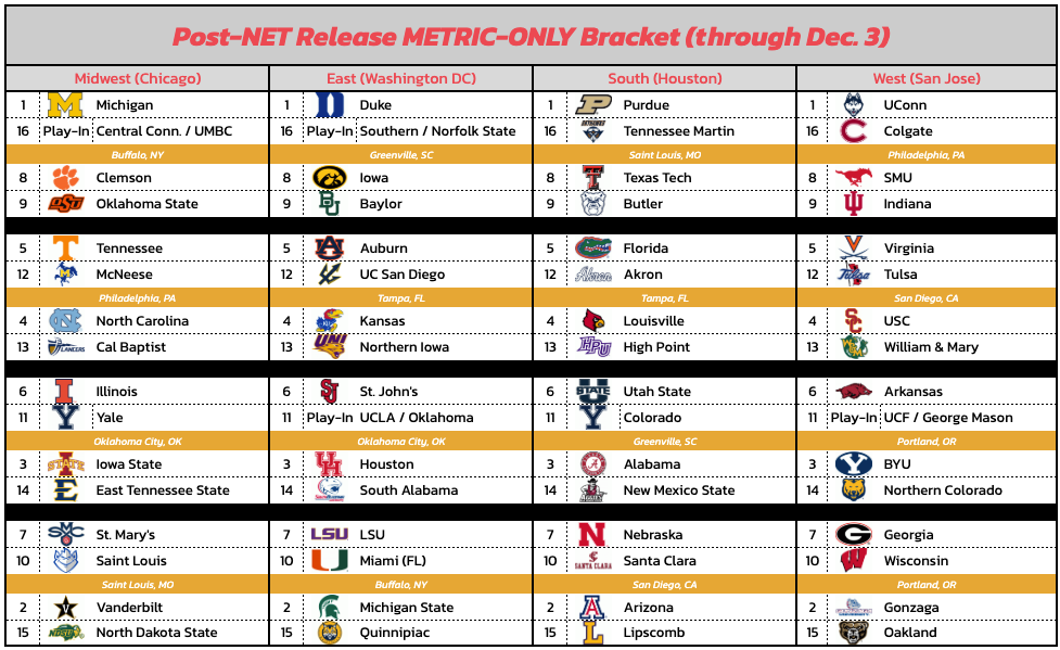 In the preseason, I compiled a raw average of Bart Torvik and KenPom's baseline rankings to put together a field built on metric baselines (here). Now armed with the NET, WAB, KPI, SOR, and BPI as added metrics, here is where things stand – from a metrics-only standpoint, without any tinkering from me except for bracketing: