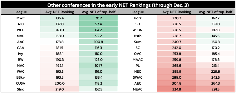 Using NET rankings of the top half of a mid-major league isn't the best indicator of multi-bid potential, though; it was just the easiest to chart for consistency. Those rankings can be dragged down by a steep drop-off after the top teams in a league. The WCC, for instance, features three at-large hopefuls with top-40 NET rankings (Gonzaga, Saint Mary's, Santa Clara) but still has a sub-60 top-half average.