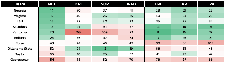Having gone through the process of averaging the teamsheet metrics, especially with their relativity to the NET, a few outliers popped out. Namely, these are teams whose either performances have not matched their results, or vice versa, or they have played a strength of schedule that is difficult to decipher placement: